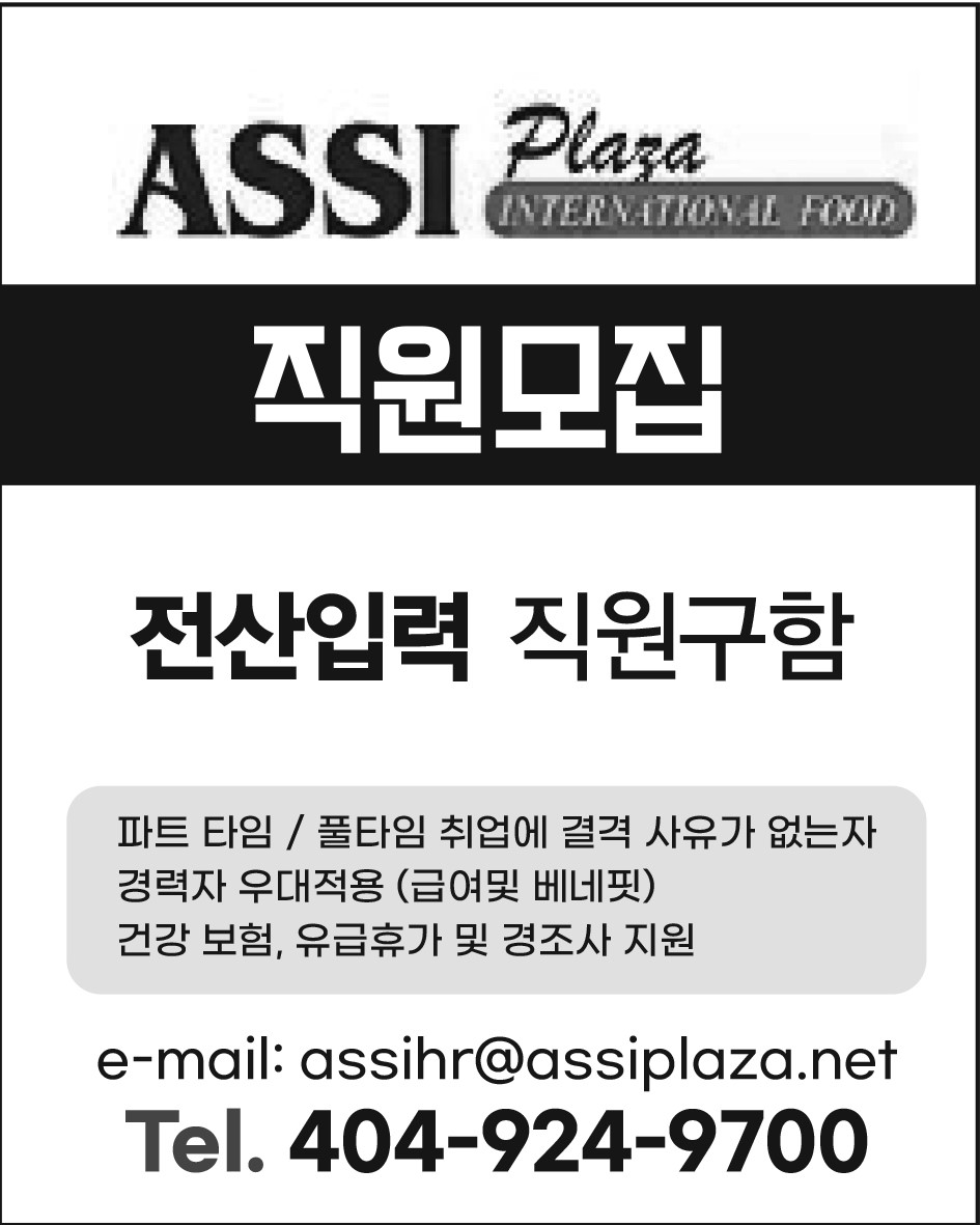 아씨플라자 전산입력 직원 구인 태양아 0 855 2021.09.17 15:51 아씨플라자 직원모집 전산입력 직원 구합니다파트타임/풀타임취업에 결격사유가 없는 사람경력자 우대 적용(급여 및 베네핏)건강보험, 유급휴가 및 경조사 지원이메일 assihr@assiplaza.net 전화 404-924-9700