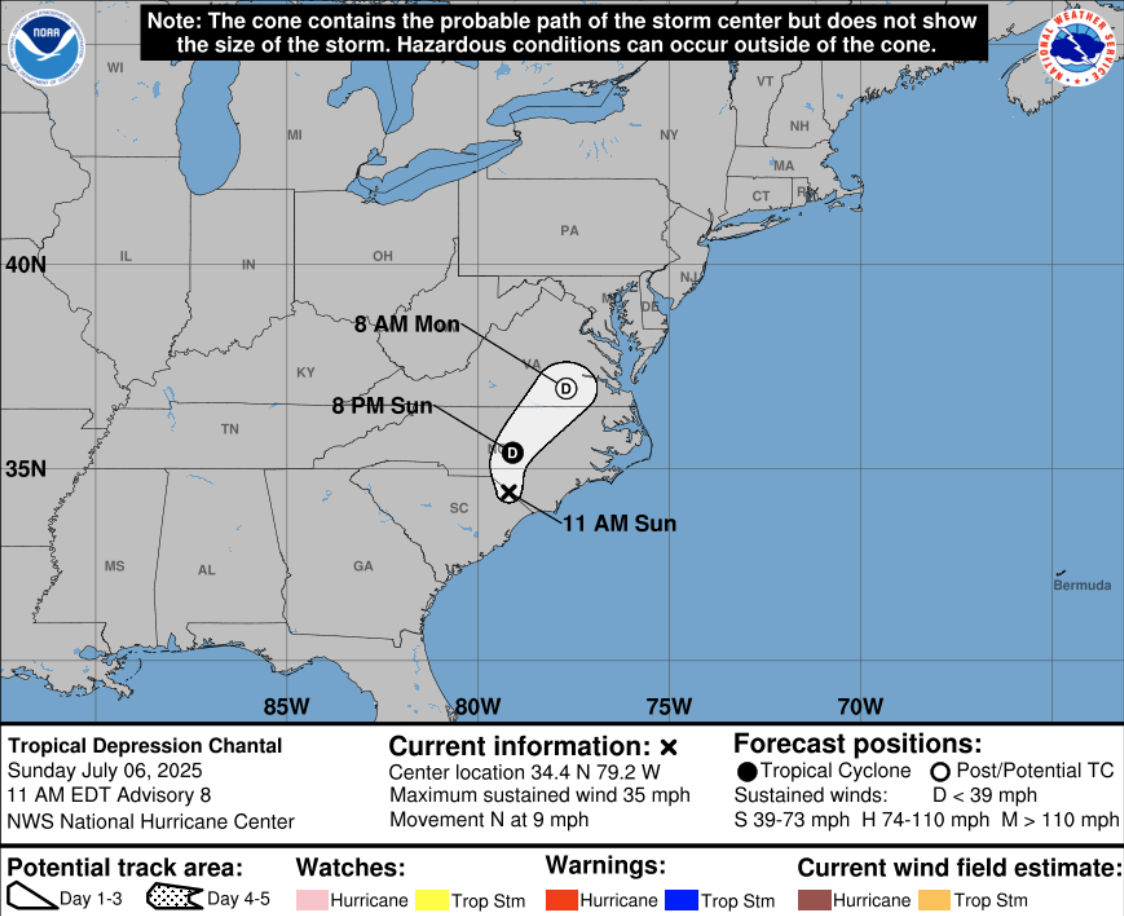 국립허리케인센터(NHC)는 6일 샹탈이 사우스캐롤라이나주 리치필드 해변 인근에 상륙했다고 발표했다. 이 폭풍은 최대 지속 풍속 시속 40마일(약 64km)로 관측됐으며, 현재는 사우스캐롤라이나주 콘웨이(Conway) 북서쪽 약 15마일, 노스캐롤라이나주 윌밍턴(Wilmington) 서쪽 약 80마일 지점에 위치한 것으로 나타났다.