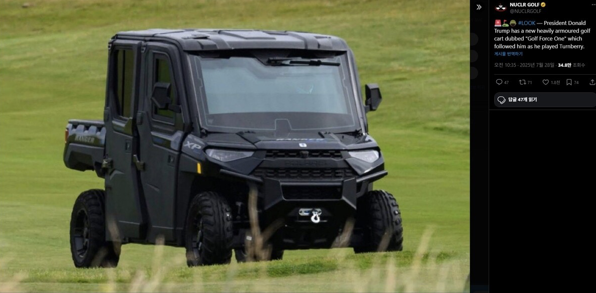 골프장을 자주 찾는 도널드 트럼프 대통령을 보호하기 위한 골프장용 방탄 차량 '골프 포스 원'이 스코틀랜드에서 처음 모습을 드러냈다.