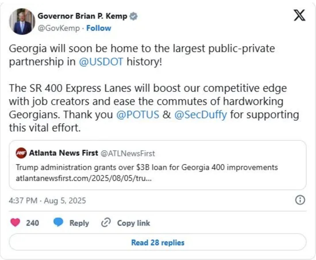 이번 프로젝트는 조지아주 교통부(GDOT)와 주 유료도로관리청(SRTA), 그리고 민간 사업자인 SR 400 피치 파트너스(SR 400 Peach Partners, LLC)가 공동으로 참여한다. 이번 융자는 단일 차입자 기준으로 미국 역사상 최대 규모다.