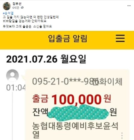 이재명 저격하던 김부선, 후원금 인증하며 윤석열 지지 선언