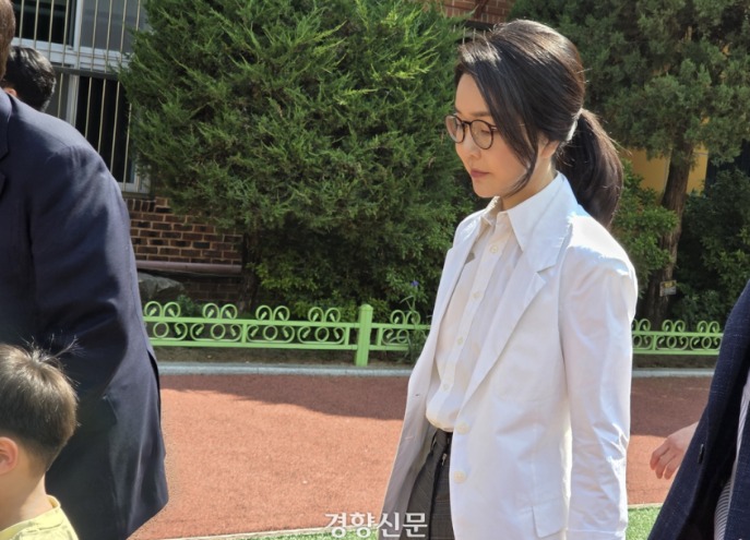 김건희 여사가 윤석열 전 대통령과 함께 지난 3일 서울 서초구 원명초등학교에 위치한 대통령 선거 투표소에 들어가고 있다. 우혜림 기자