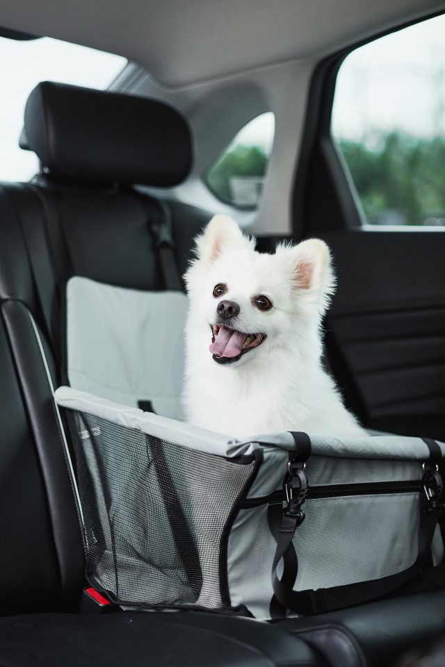 모두의 안전을 위해 차량용 펫시트(애견용 카시트)가 필요하다. 펫시트는 짧은 연결줄로 개를 연결하여 마치 안전벨트 처럼 개가 튕겨나가지 않고 펫시터에 의해 보호받도록 만들어져 있다. 출발 당일 펫시트를 처음 경험시키기 보다는 출발 전에 펫시트를 실내에 두고 익숙해지도록 적응 기간을 가지도록 유도한다.