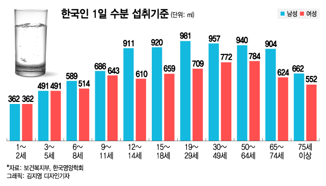반면 남성은 75세 이상이 되면 하루 물 섭취기준은 662ml로 낮아진다. 여성도 같은 연령대에서 552ml로 절반 가까이 줄어든다. 각각 5.5잔과 4.6잔 수준이다.