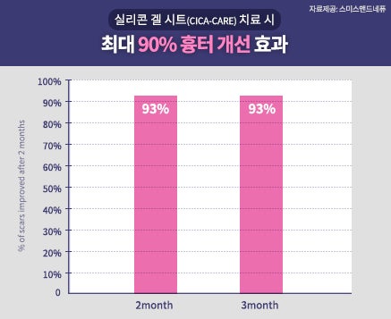 시중에 잘 알려진 흉터치료제 ‘시카케어’를 제조하는 스미스앤드네퓨사에서 진행한 임상 연구 결과에 따르면, 2세에서 60세 사이 연령의 붉거나 착색된 흉터를 가진 사람 42명을 대상으로 2개월, 6개월간 당사의 실리콘 겔 시트를 사용했을 때, 두 그룹 모두 흉터의 약 93%가 개선된 것을 확인할 수 있었습니다.