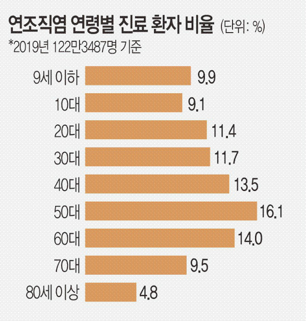 국민건강보험공단의 최근 발표에 따르면 2019년에 122만3000여명의 연조직염 환자가 병원을 찾았다. 월별로 보면 8월 16만1938명, 7월 15만2863명이 진료받아 1·2위를 차지했다.