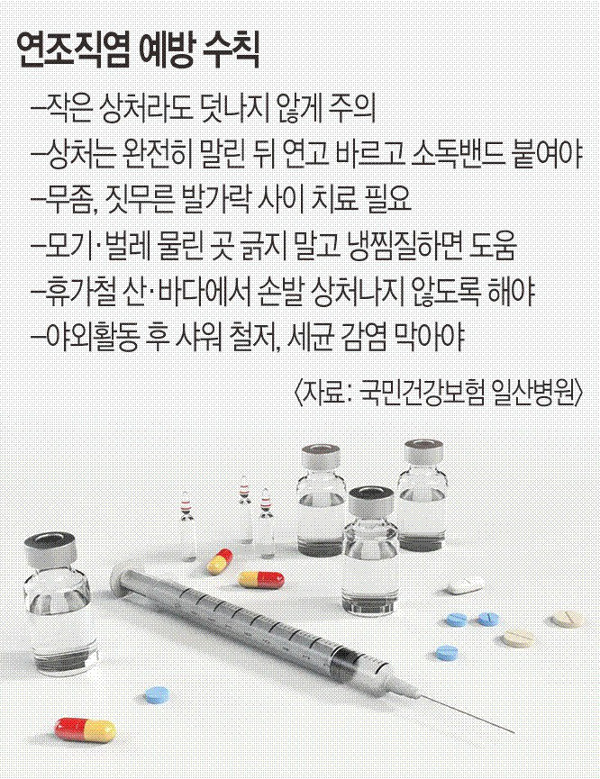 여름철 연조직염 예방의 첫걸음은 상처를 되도록 빨리 아물게 하는 것이다. 작은 상처라도 완전히 말린 뒤 연고를 바르고 소독 밴드를 붙여 주는 것이 좋다. 무좀이나 발가락 사이 짓무름이 있으면 바로 치료해야 한다.