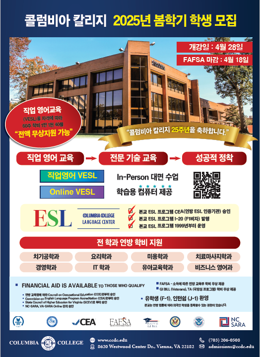 버지니아 비엔나에 본교를 둔 콜럼비아 칼리지가 2025년 3월 24일 개강 학생을 모집합니다.