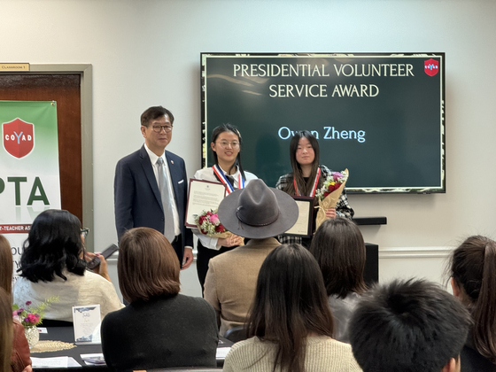 (왼쪽부터) 폴 임 대표, 에일린 정 학생, 유신 리 학생. 폴 임 코야드 대표가 학생들에게 대통령봉사상을 전달했다.