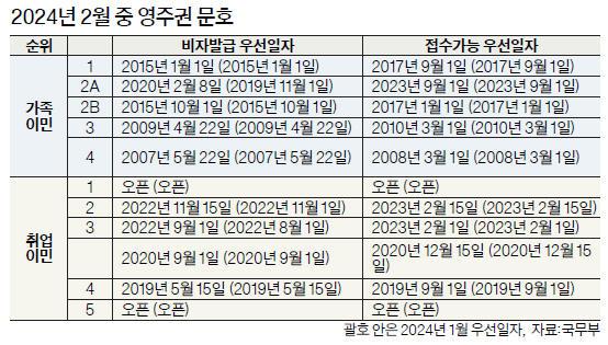 국무부가 12일 발표한 ‘2024년 2월 중 영주권 문호’에 따르면, 가족이민과 취업이민 일부 순위에서 비자발급 우선일자가 소폭 전진하는 모습을 보였다. 다만 움직임이 없는 나머지 순위의 경우 전반적인 답보 상태를 유지했다.