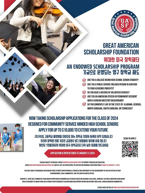 위대한 미국 장학재단(GASF)이 동남부 5개 주에 거주하는 한인 학생들을 대상으로 최대 1만 달러 장학금을 제공하며 오는 31일까지 장학생을 모집하고 있다.