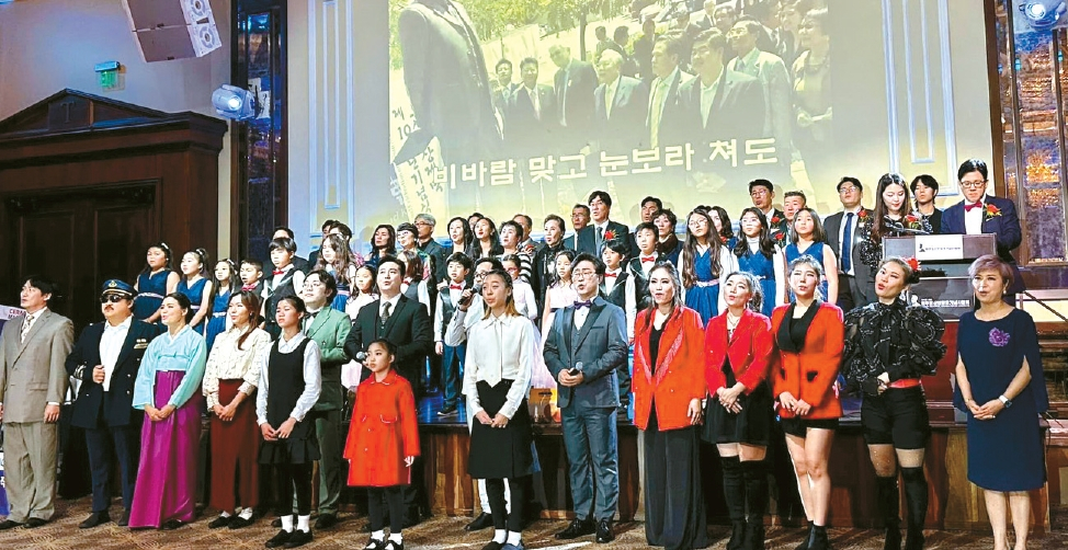 19일 개최된 미주도산안창호기념사업회의 갈라행사에서 ‘뮤지컬 도산’팀과 도산기념사업회 관계자들이 무대에서 노래를 부르고 있다.