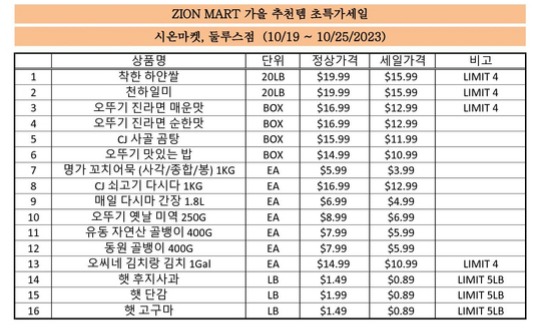세일 품목 중에는 착한 하얀쌀과 천하일미가 정가 19.99달러(20파운드)에서 15.99달러로 할인한다. 오뚜기 진라면 박스는 12.99달러(정가 16.99달러), CJ 사골곰탕 박스는 11.99달러(정가 15.99달러), 오뚜기맛있는밥 박스는 10.99달러(정가 14.99달러)다.