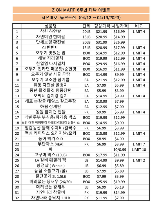 또 여름이 다가오며 배춧값이 상승한 가운데, 정상가 14.99달러인 '오씨네 김치랑 김치'를 9.99달러에 제공한다. LA갈비도 파운드당 14.99달러에서 9.99달러에 할인하며, 인기가 많아 수량 확보가 힘들었다는 동원 참치캔 번들도 6.99달러(정상가 9.99달러)에 제공한다.
