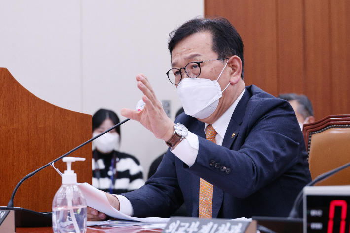 석동현 민주평화통일자문회의 사무처장이 17일 오후 국회에서 열린 외교통일위원회에서 의원 질의에 답하고 있다. 연합뉴스