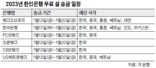 추석과 더불어 민족 대표 명절인 설(1월 22일)을 앞두고 남가주에 지점을 둔 한인은행들이 ‘무료 송금 서비스’를 시작한다.