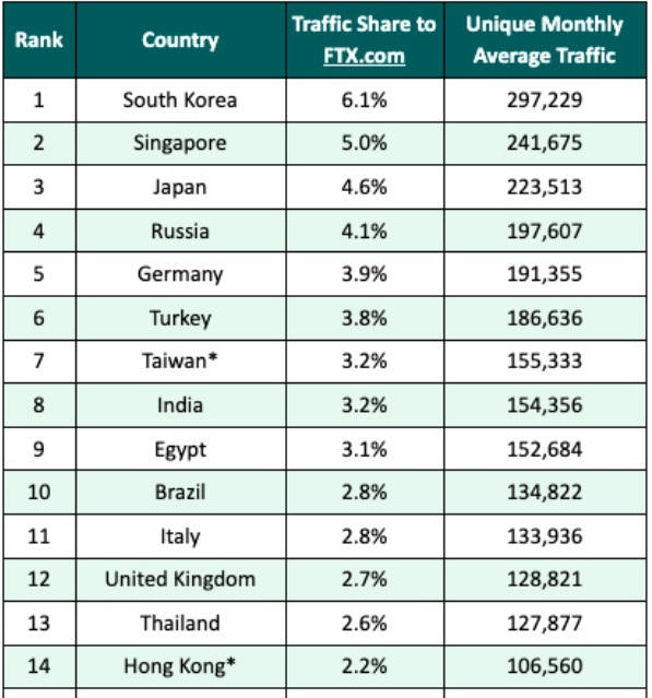 한국과 싱가포르, 일본의 월간 사용자 수는 해당 기간 FTX 전체 트래픽의 15.7%를 차지했다.