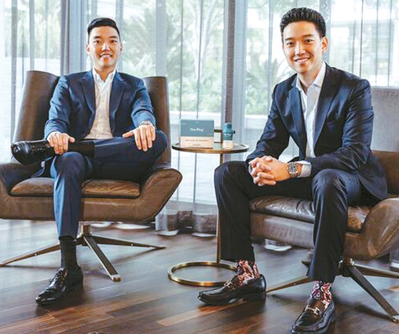 더플러그 드링크의 저스틴 김(왼쪽) COO가 포브스 선정 30세 미만 기업인에 뽑혔다. 레이 김 CEO와 함께 앉아 있다. [더플러그 드링크 제공]