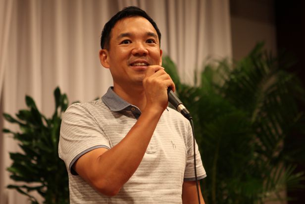 김정주 NXC 이사가 지난 2012년 대구 게임업체 KOG의 사내 강연에 참석한 모습. /넥슨 제공