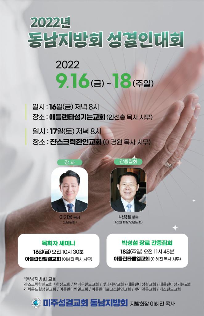 미주성결교회 동남지방회(지방회장 이혜진 목사)는 ‘2022년 동남지방회 성결인대회’를 오는 9월 16일(금)부터18일(주일)까지 애틀랜타 지역의 속속 교회들에서 개최한다.