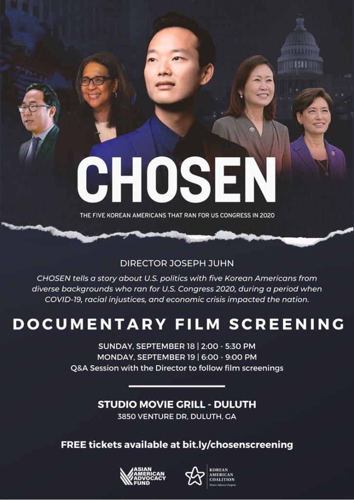 2020년 미국 연방 하원에 도전했던 한인 5명의 이야기를 담은 다큐멘터리 ‘Chosen' 시사회가 오는 9월 18일과 19일 이틀 동안 애틀랜타에서 열린다.