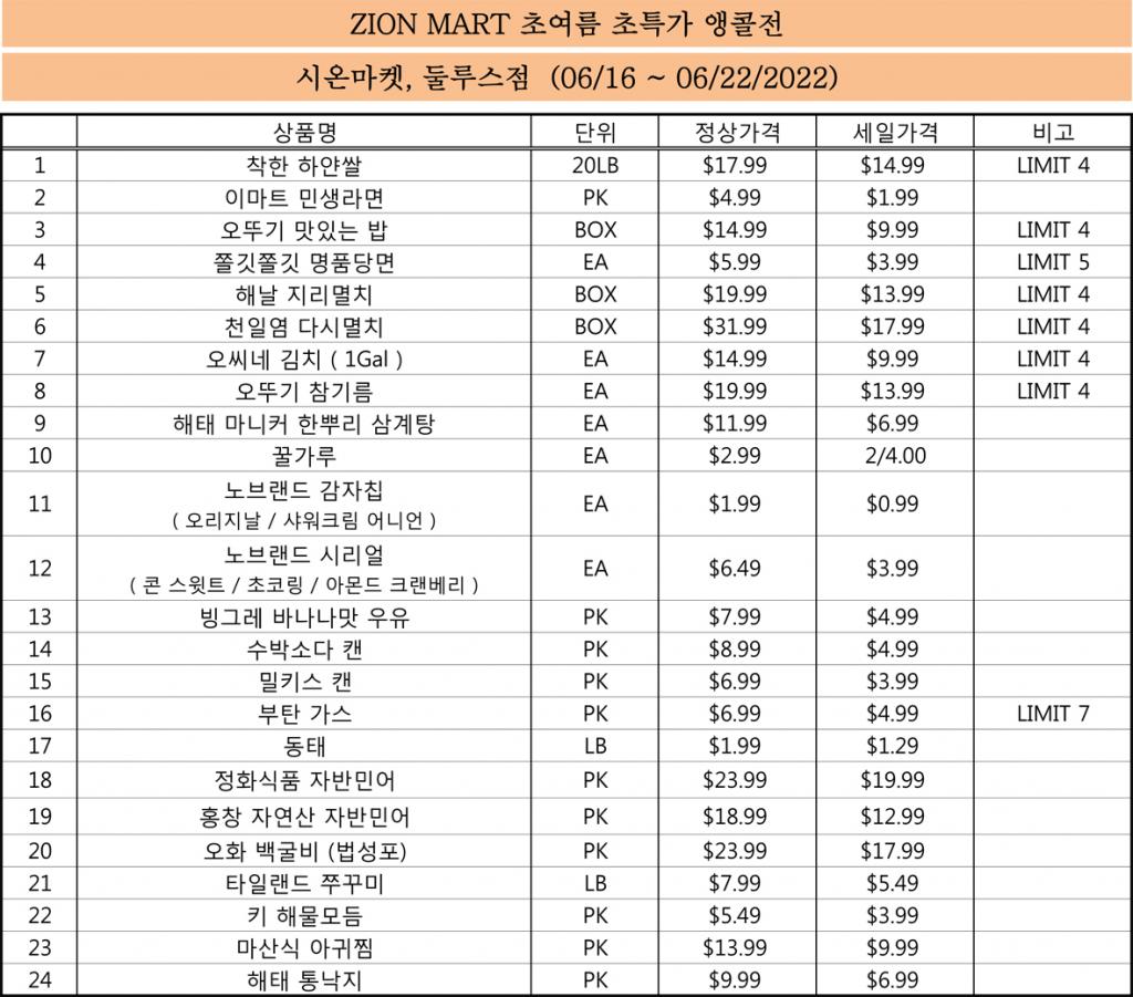 15일까지 진행됐던 시온마켓 둘루스지점(지점장 전무배)의 ‘6월 초여름 초특가 세일’이 16일부터 22일까지 1주일 연장돼 앵콜전으로 개최된다.