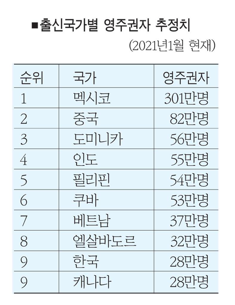 이같은 한인 영주권자 추정치는 미국내 전체 영주권자 1,311만 명의 2.1%에 해당하는 것으로 출신 국가별로는 9번째로 많은 것이다.