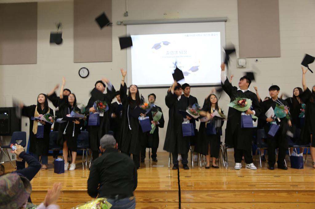 7일 애틀랜타한국학교 제27회 졸업식에서 18명의 졸업생들이 퇴장에 앞서 졸업모를 집어던지며 자축하고 있다.