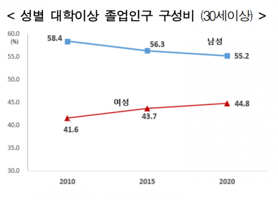 30세 이상 인구 중 대학이상 졸업인구는 2015년 38%에서 2020년 43.1%로 늘었다. 남성의 대학이상 졸업인구 비중은 58.4%(2010년)→56.3%(2015년)→55.2%(2020년)으로 꾸준히 줄어든 반면, 같은 기간 여성은 41.6%→43.7%→44.8%로 늘었다. 이에 따라 성별 교육격차는 지속적으로 줄어드는 추세다.