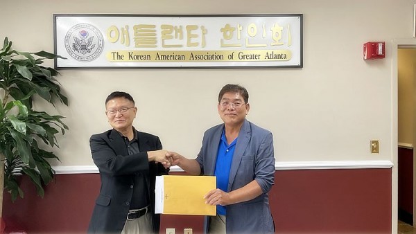 지난 10일 오후 노크로스 한인회관에서 한인 이홍기(왼쪽) 씨가 제35대 한인회장 선거관리위원회 김일홍 위원장에게 입후보 등록 서류를 전달 받고 있다. |