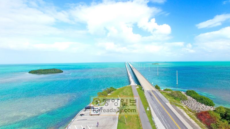 키웨스트 가는 길, 참으로 별나고 요상스럽다. 흡사 누에가 기어가면서 일렬로 알을 갈겨놓은 듯 섬 하나 다리 하나, 다리 하나 섬 하나가 마이애미에서 1번 하이웨이 남쪽으로 150마일나 이어진다. 이 길은 미국에서도 가장 멋진 드라이브 코스로 알려진 길로 다리 하나가 7마일이나 되는 되는 긴 다리(7마일브리지)도 있다.