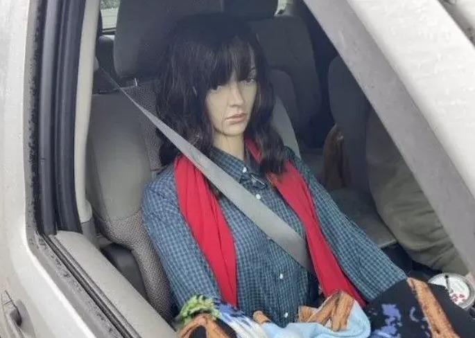 경찰이 정차된 차량을 조사한 결과, 조수석에는 갈색 가발과 셔츠, 스카프를 착용한 마네킹이 앉아 있었다.